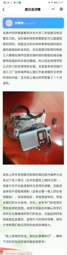 学院这一举措让在外实习的学子倍感温馨,大家纷纷表示,学院在经费极为有限的情况下为每位学生配备实习讲解器,非常贴心,学院以学生为本,用心用情用力解决学生的实际问题和困难,极大增强了同学们的获得感、幸福感,很多同学在朋友圈等微信平台纷纷学院党委的暖心举动点赞!