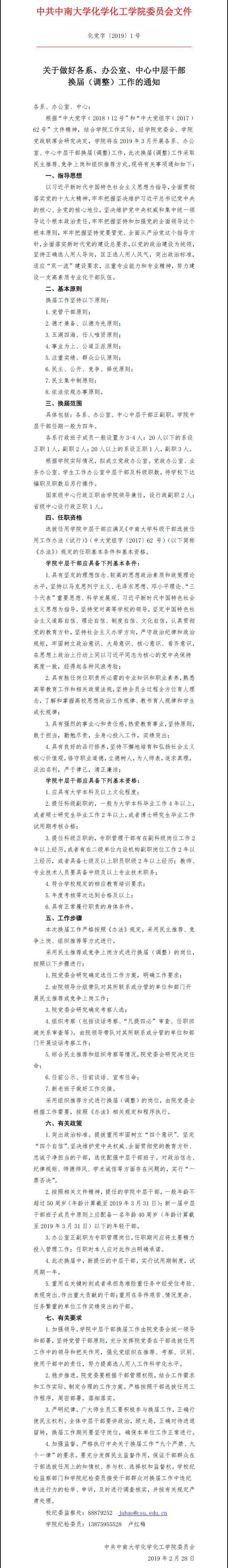 关于做好各系、办公室、中心中层干部换届(调整)工作的通知