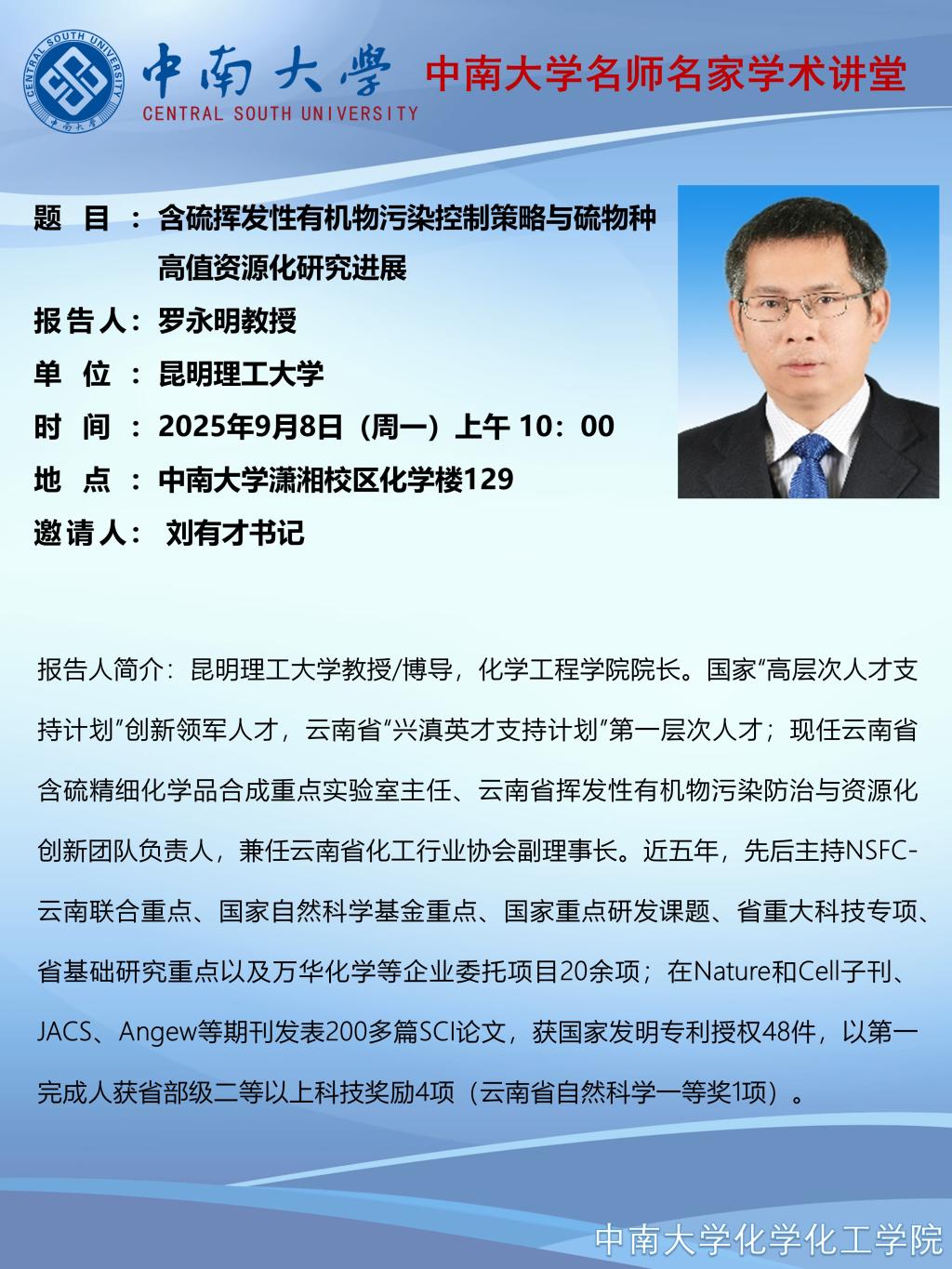 报告题目:含硫挥发性有机物污染控制策略与硫物种高值资源化研究进展 报 告 人:罗永明教授 昆明理工大学 时 间: 2025年9月8日(周一)上午 10:00 地 点: 伟德betvlctor1946潇湘校区化学楼129