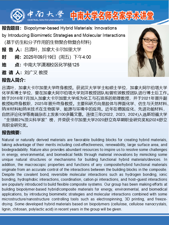 报告题目:基于仿生和分子作用的生物聚合物复合材料) 报 告 人:吕清叶,加拿大卡尔加里大学 时 间: 025年09月19日(周五)下午4:00 地 点: 伟德betvlctor1946潇湘校区化学楼125