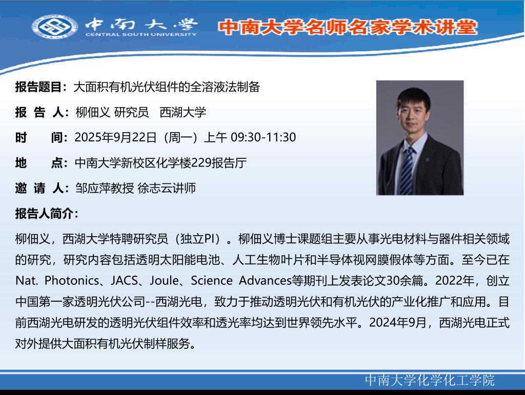 报告题目:大面积有机光伏组件的全溶液法制备 报 告 人:柳佃义 研究员 西湖大学 时 间: 2025年9月22日(周一)上午 09:30-11:30 地 点: 伟德betvlctor1946新校区化学楼229报告厅