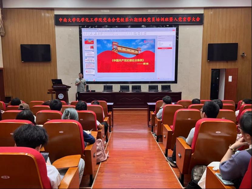 为深入学习贯彻党的二十大精神,增强预备党员对党的基础知识和创新理论的理解,提高其思想觉悟,加强党纪学习教育,6月19日下午,学院党委在化工楼133报告厅举行了第六期预备党员培训班暨入党宣誓大会。院党委书记、分党校校长刘有才,院党委专职组织员、分党校办公室主任汪菁垚,本科生化工第一党支部书记、院党委分党校第49期积极分子培训班班导师肖茜斤出席本次大会,第18期发展对象培训班顺利结业的64名预备党员参会。本次会议由预备党员培训班班导师谭澳利主持。