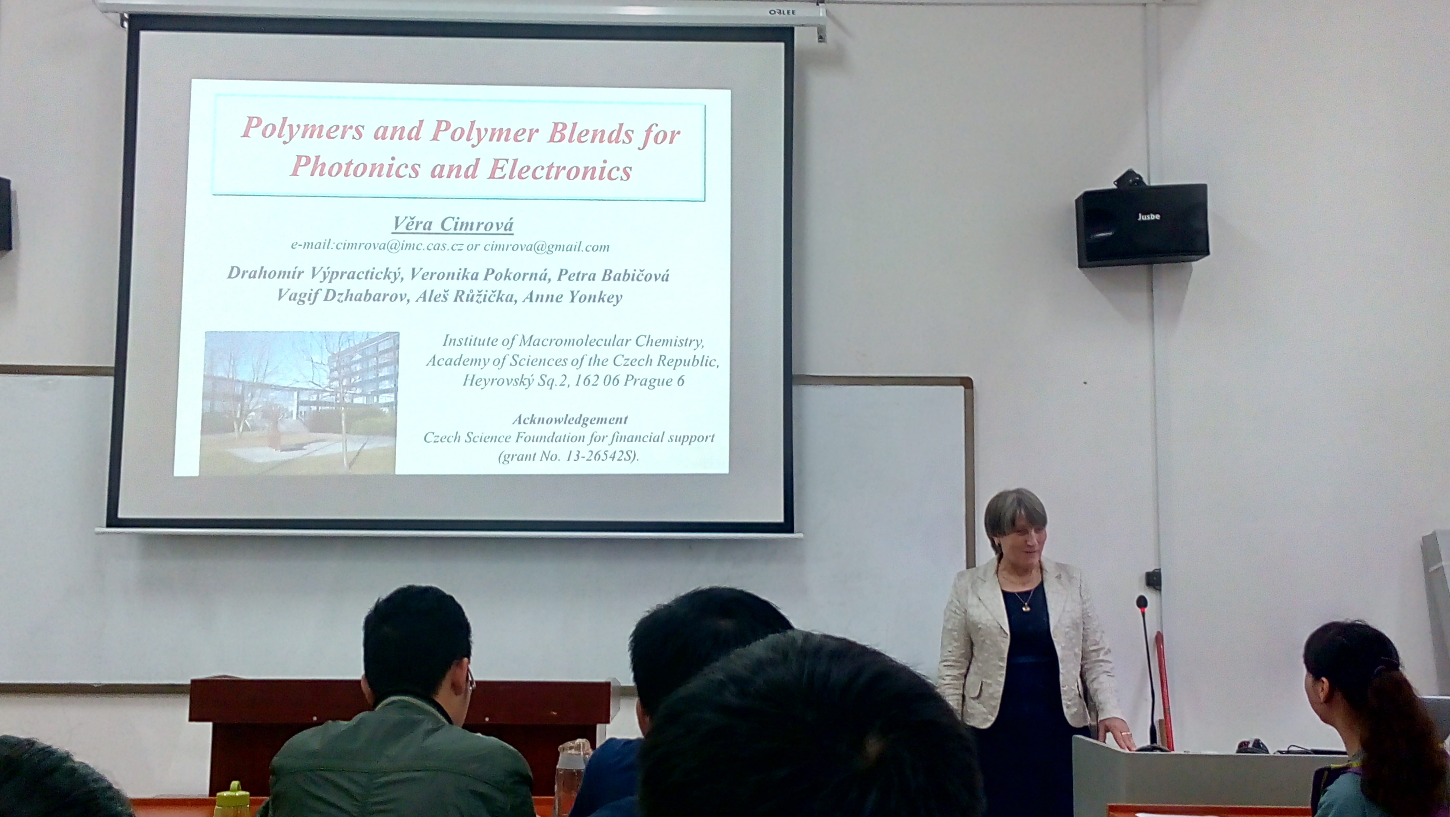 Prof. Vera Cimrova,于1984年在布拉格查理大学获硕士学位,之后在捷克科学院获得博士学位。2003年成为捷克科学院大分子研究所的领导人。2006年,她在查理大学物理与数学系担任教职工作。1993-1995年在德国马克斯·普朗克学会中做了三年聚合物方面的研究,她的研究方向主要是超薄聚合物膜的光物理以及电化学性能;电荷的光产生和传输,光致发光以及电致发光,拥有光导的聚合物及其混合物。研究设计了新的光电聚合物以及聚合物体系(例如光电二极管,太阳能电池,光存储等)。她发表的国际刊物和著作达97篇,是高分子研讨会专刊的编辑。同时她还是捷克科学基金会的主席,是大分子物理光学生物物理的评审组成员,以及众多编辑部的成员。