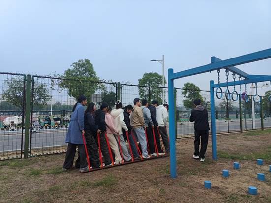 活动设置了双人同行、荡木桥挑战、无轨电车、同心鼓等多个兼具趣味性与挑战性的项目。在双人同行项目中,同学们两两搭档,于钢丝之上相互扶持,在平衡与协作的博弈中,让默契在一次次尝试中不断升温;荡木桥挑战环节,大家在摇荡的木桥上稳步前行,每一次迈步都是对勇气与协调能力的考验,更收获了突破自我的喜悦。