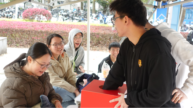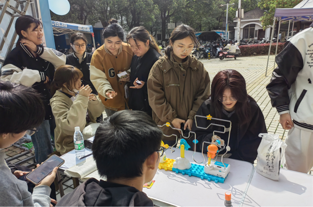 “电磁迷宫”活动是由参与的同学,执小铁环从右到左“闯关”,若没有触碰到轨道代表挑战成功,若听到报警声则挑战失败,可以重新挑战。“电磁迷宫”小游戏吸引了过路的同学,使得活动参与的人数增多,同学们热情高涨,都积极参与到有关权益问题和知识的活动当中。