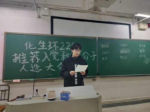为响应党的号召,积极向党组织靠拢,发挥团支部作为党组织的助手和后备团的作用,3月28号晚,化学生物环境类2209班于新校区D座106教室开展了团支部入党积极分子推优大会。