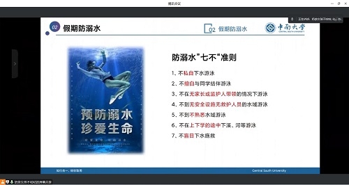 本次大会中,胡老师首先从防火、防电、防溺水、防电信诈骗及预防流行性疾病几个方面告诫同学们不可忽视生命财产安全。胡老师强调,在假期适度娱乐的同时,一定要注意好自身安全,切记防微杜渐,与安全有关的事项一刻也不能松懈。同时胡老师还指出,大学生受电信诈骗案件时有发生,同学们应当牢记保护好自己的财务,不可轻信陌生人,有任何拿不准的事情第一时间与辅导员采取联系。