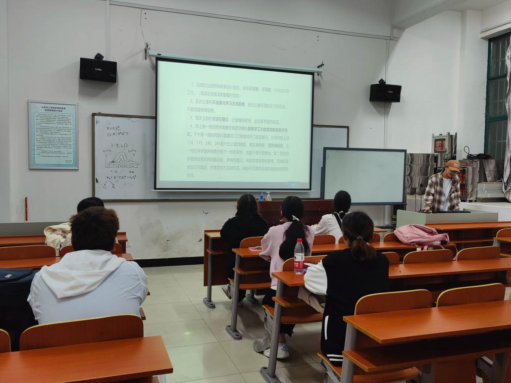 会议开始,首先介绍的是“助理需知”部分,为新助理们讲解了值班办公室的基本情况,如:教师座位分布、办公室钥匙位置、考勤登记等基础信息,带领新助理深入了解值班场地。第二,所讲述的是“工作时间”部分,助理工作的时间每天分为四班,同时指出了其时间与上课时间的略微区别,提醒新助理们勿记错时间。第三,是最重要的部分—“主要工作”部分,详细介绍了学生助理的日常工作,如:早晚打扫卫生、接听办公室来电、化工楼借教室流程、第一班助理打印值班表等等。第四,便是“注意事项”部分,此部分主要介绍了助理工作中的细节部分,提醒新助理们一些容易工作出错的地方,如:下午最后一班必须倒垃圾、注意个人卫生等细节问题。