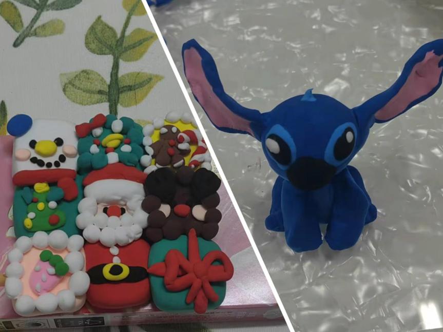 活动过程中同学们大胆创新,各展奇思,创作出如史迪奇、圣诞树、小章鱼、小绵羊等姿态各异、灵动可爱的黏土作品。这些充满趣味的黏土作品不仅表达了同学们美好的希望,也是“愈捏愈乐”心理积极体验营期间轻松时光的珍贵纪念品。