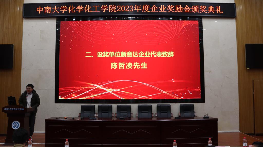 首先,陈哲凌先生致开场辞。他先向大家介绍新赛达的由来,讲述它是由几位85级应用化学专业的学长所建立,同时表示企业重视对优秀学生和困难学生的资助工作,并希望化院学子秉承前辈们的优秀品质,继承前辈们的赤子之心,积极进取的姿态全力报效祖国,担负起新时代赋予的责任和使命。