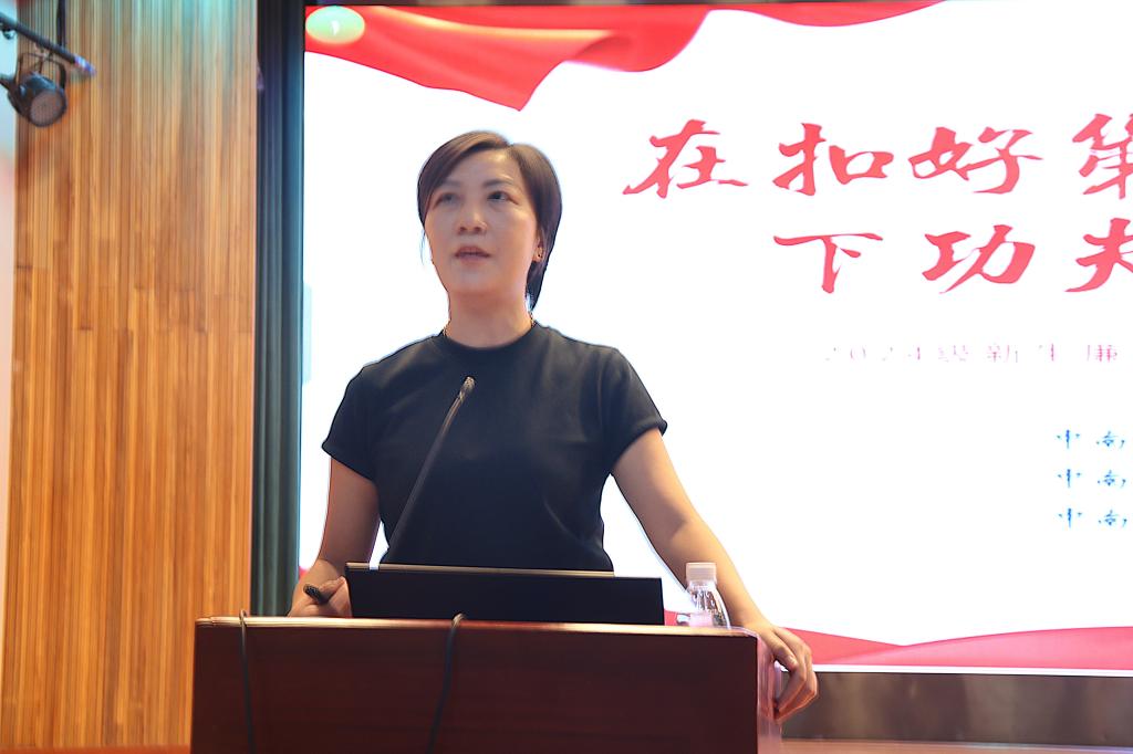 首先,滕晓雯书记围绕坚定理想信念、严守纪律规矩、勇于担当奋斗三个方面,详细阐述了如何扣正、扣牢、扣好“第一粒扣子”。她强调了四个中国共产党伟大建党精神,并通过分享汤飞凡、陈新民、王传福等多位来自中南的院士及有名企业家的事例,勉励同学们厚植爱国情怀,践行使命担当,矢志青春奋斗,做“敢奋斗、有责任、有担当”的中南人。
