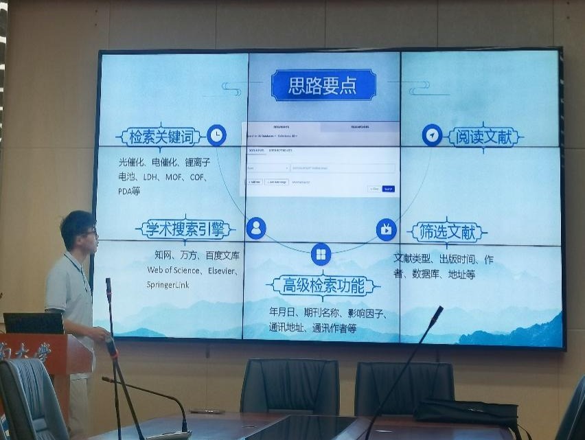 分享会上,胡俊从文献检索、文献阅读、文献整理及论文写作四个方面入手,深入讲解了如何科学、高效地查阅和整理文献,并结合自己的研究经历,分享了论文写作的实用技巧及论文投稿注意事项。他的细致分析和现场演练让在场的同学们豁然开朗。随后,他带领同学们围绕研究生生活中的时间管理和自我认知问题展开讨论,他建议同学们培养兴趣爱好,在学习与生活之间找到平衡,正确面对科研过程中的挑战与压力,通过调整和优化自身状态,从容地规划学术之路。