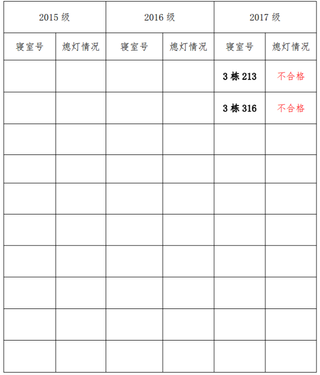 为改正各种不良现象和陋习,增强宿舍学习氛围,营造温馨家园氛围,伟德bv1946官网首页团委学生会生活权益服务部对三个年级所有寝室进行熄灯检查。本次熄灯情况通报不合格寝室2间,具体情况如下: