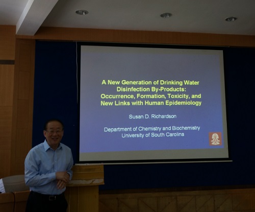 接着同学们怀着望开茅塞的心情迎来了期待已久的Susan Richardson教授的演讲,Susan Richardson教授主要针对在饮用水消毒过程中消毒剂会与水中的微量有机物反应生成消毒副产物的现象,介绍了近年来受到关注的消毒副产物的种类和检测方法,并讨论其形成机制,环境归宿和控制策略。Susan Richardson教授的讲演内容十分丰富,整个讲座风趣幽默,同学们对消毒副产物种类、检测方法及环境行为的产生了极大兴趣。演讲过程中,Susan Richardson教授更是与在场的同学及教师们多次互动,现场爆出阵阵掌声,使得同学们对自己疑惑的问题积极的提问。针对每个同学提的问题,Susan Richardson教授耐心解答,同学们受益匪浅。